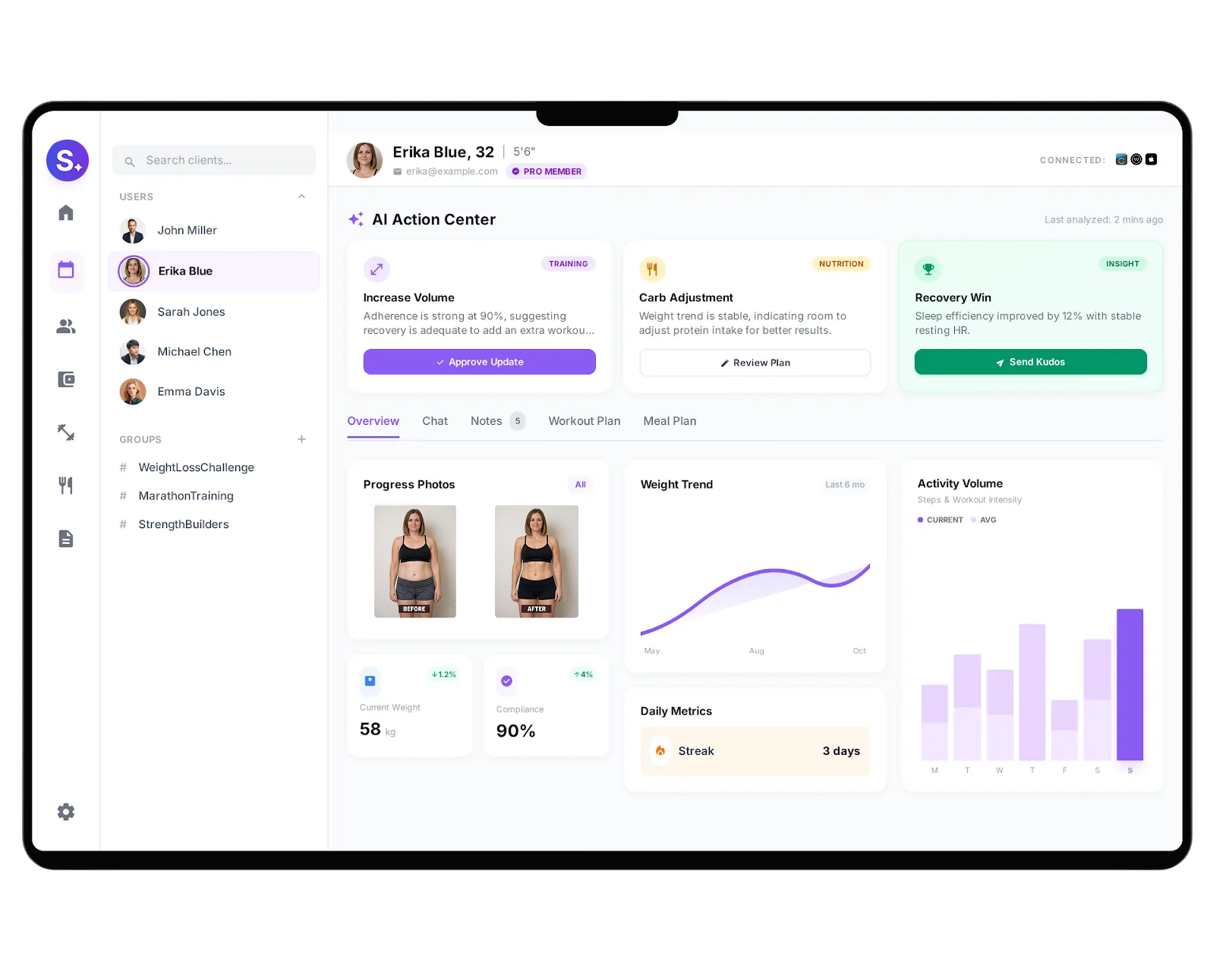 Build plans, track progress, manage payments, and deliver a seamless client experience—on your own branded AI-powered app. Save time and scale effortlessly.